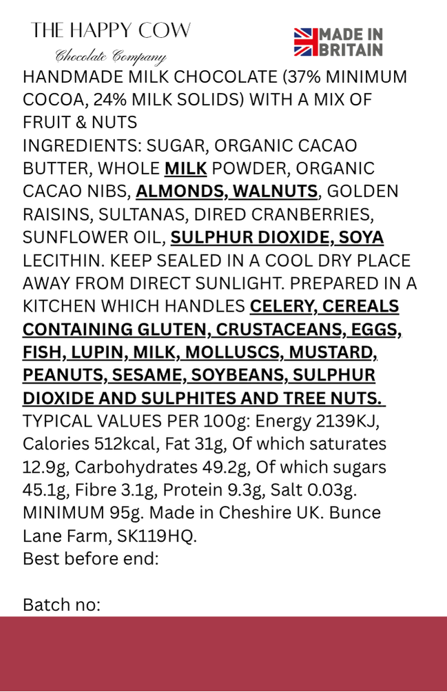 We have paired our creamy and rich Handmade Milk Chocolate with a deliciously crunchy and chewy fruit & nuts mixture to create the perfect balance of indulgent and scrumptious. We use a mixture of almonds, walnuts, golden raisins, sultanas and sweetened dried cranberries.