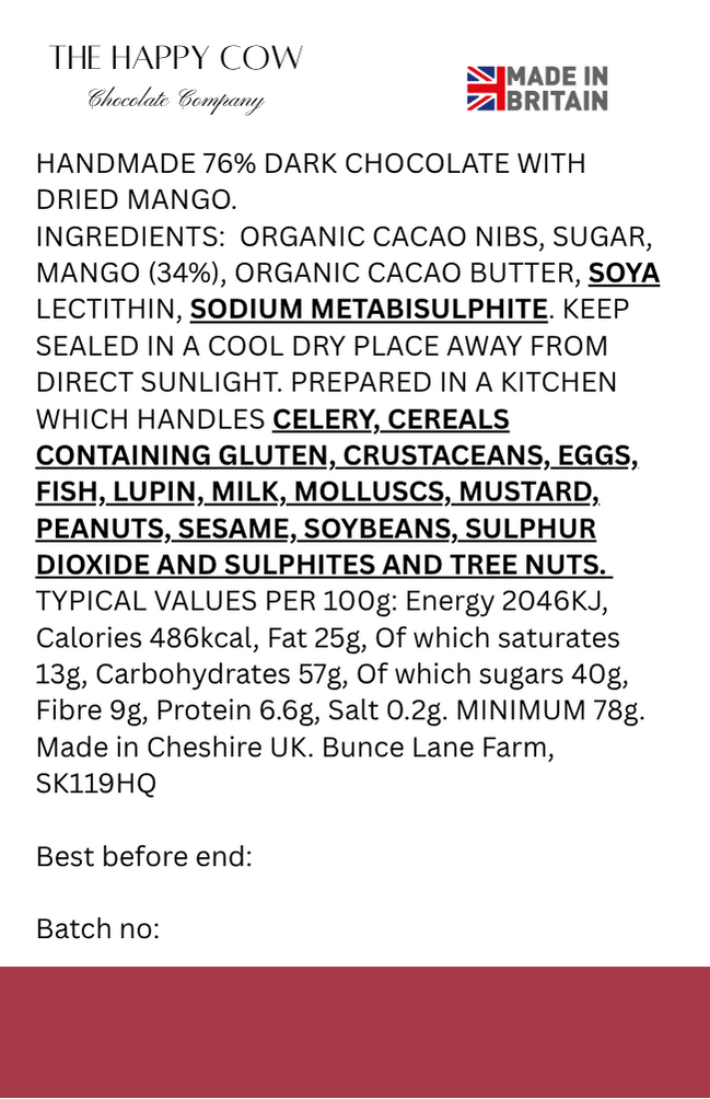 We have paired our AWARD WINNING - Great Taste Award - Handmade 76% Dark Chocolate with deliciously sweet and chewy dried mango to create the perfect balance of bold flavour, smooth richness and tangy fruit.